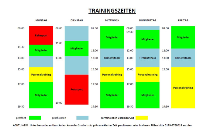 Ich bitte alle Trainierenden darum entsprechende Termine mit mir abzusprechen. Wir werden für alles eine Lösung finden.